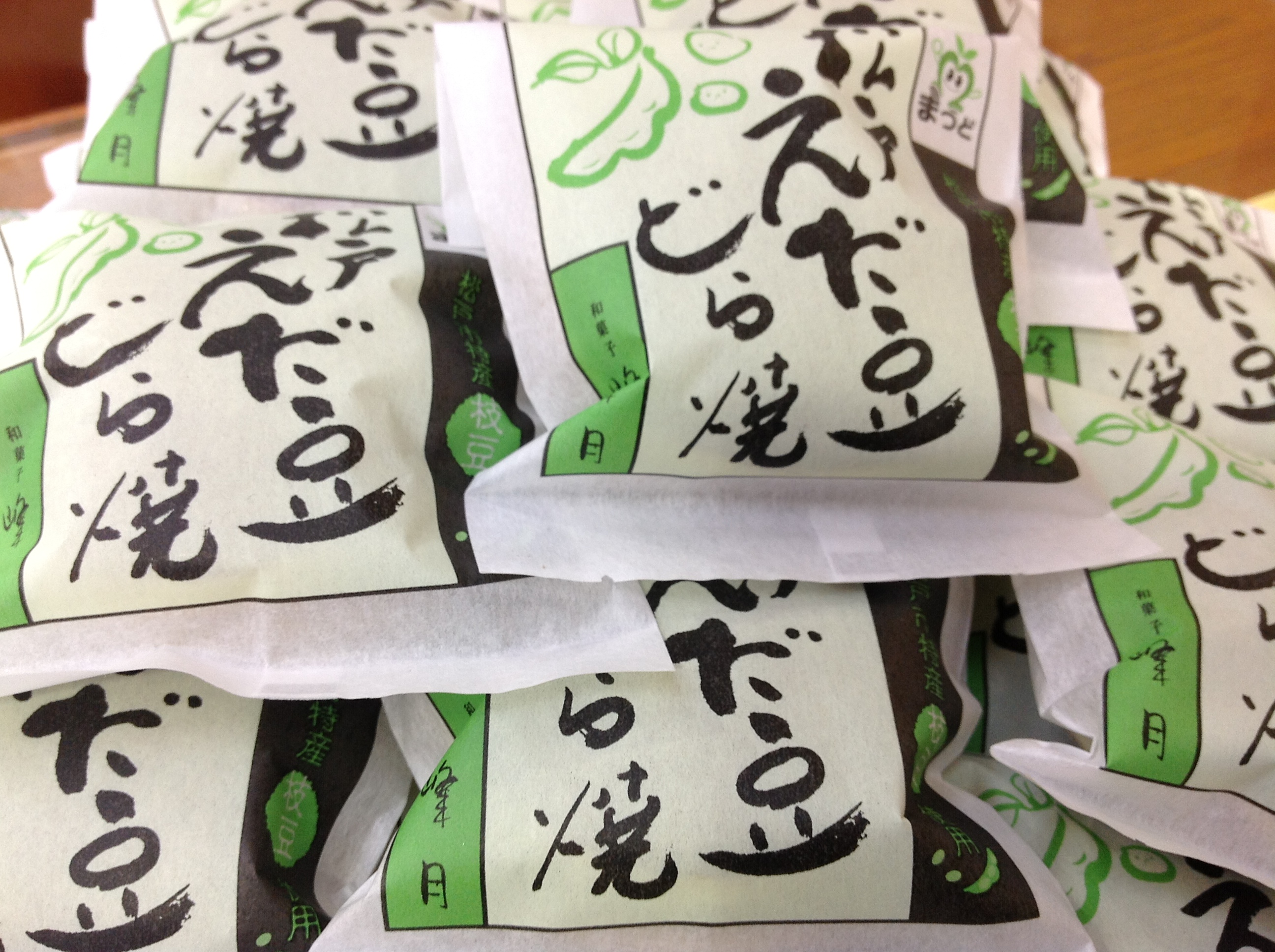 | 新発売のえだ豆どらやき。青々しい枝豆の香りと鮮やかなグリーンの枝豆餡を峰月自慢のふわふわのどら焼きの生地で挟みました。 | |