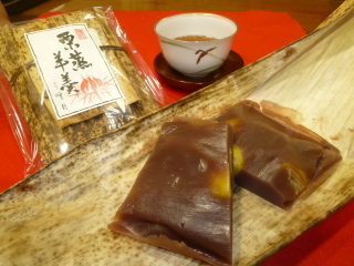 | 峰月でもファンの方が多い栗むし羊かん。秋になると店頭に並びます。大きな栗がゴロゴロっと入り、峰月自慢の上品なこし餡を使用し、竹皮で包んで蒸し上げました。もちもちっとした食感とほんのりついた、竹の香りは一度食べたらやみつきになるほと美味しいです。また、他のお店とは少し違った竹皮を使用した包みはとてもレトロで、ちょっとしたお持たせにも最適です。 | |