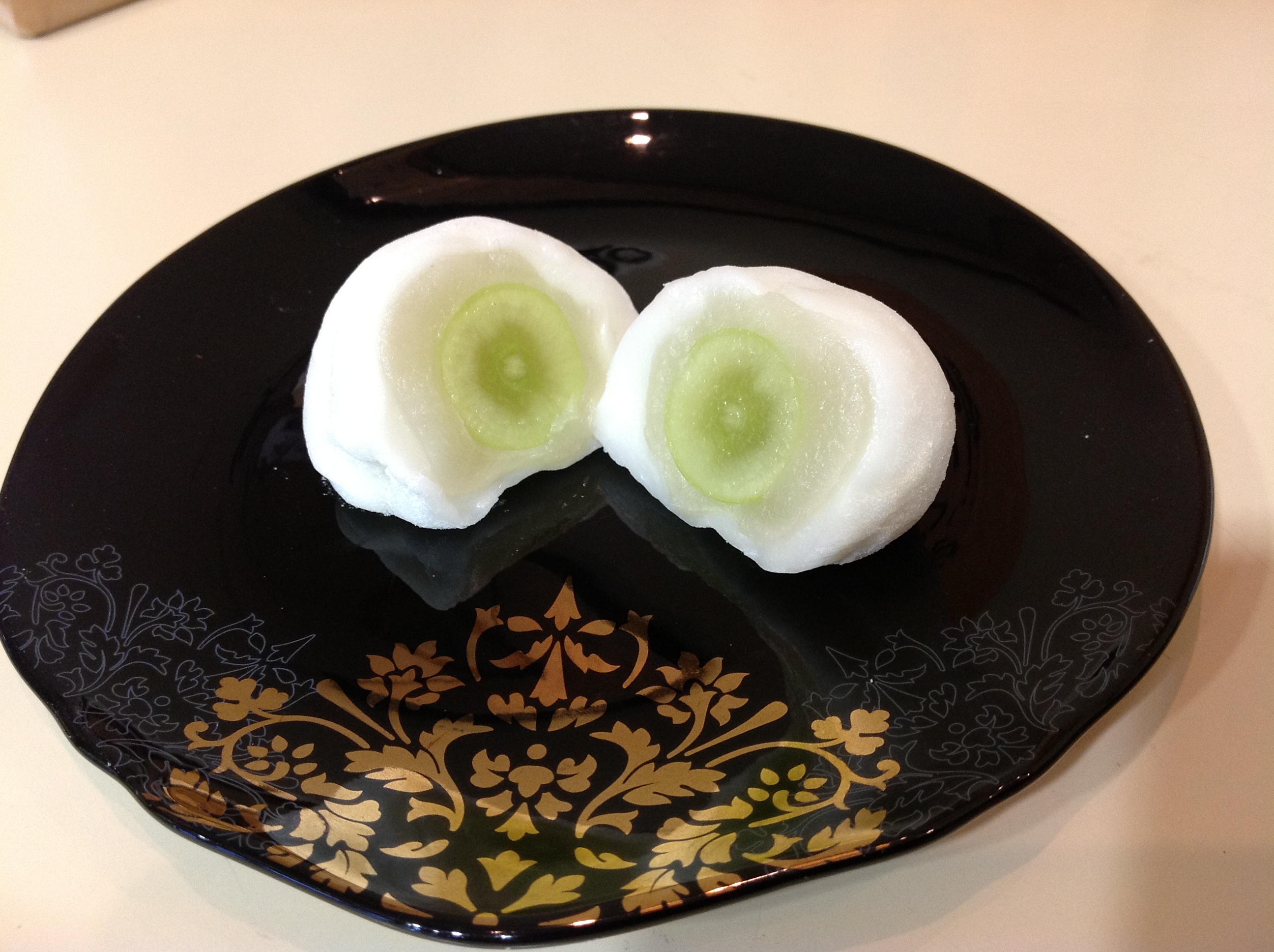 | みずみずしいうす緑色の宝石のような大粒、種なしシャインマスカットを峰月の上品な白あんともちもちのお餅で包みました。マスカットの美味しい季節限定商品です。 | |