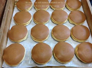 峰月自慢の生地がふわふわのどら焼きの 焼き上がりです。 これから、ウサギさんの焼印が押されます。 |